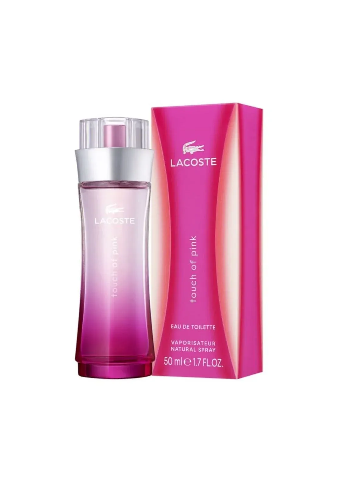 The bottle is iconic for its slender, curved silhouette and a gradient pink-to-clear glass design that feels sporty yet chic—staying true to the Lacoste brand identity.